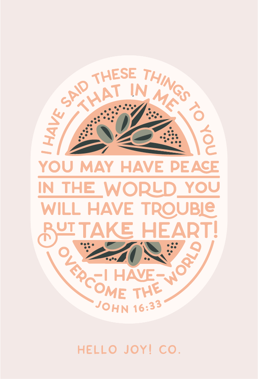 “I have said these things to you, that in me you may have peace. In the world you will have trouble. But take heart; I have overcome the world.” Get...