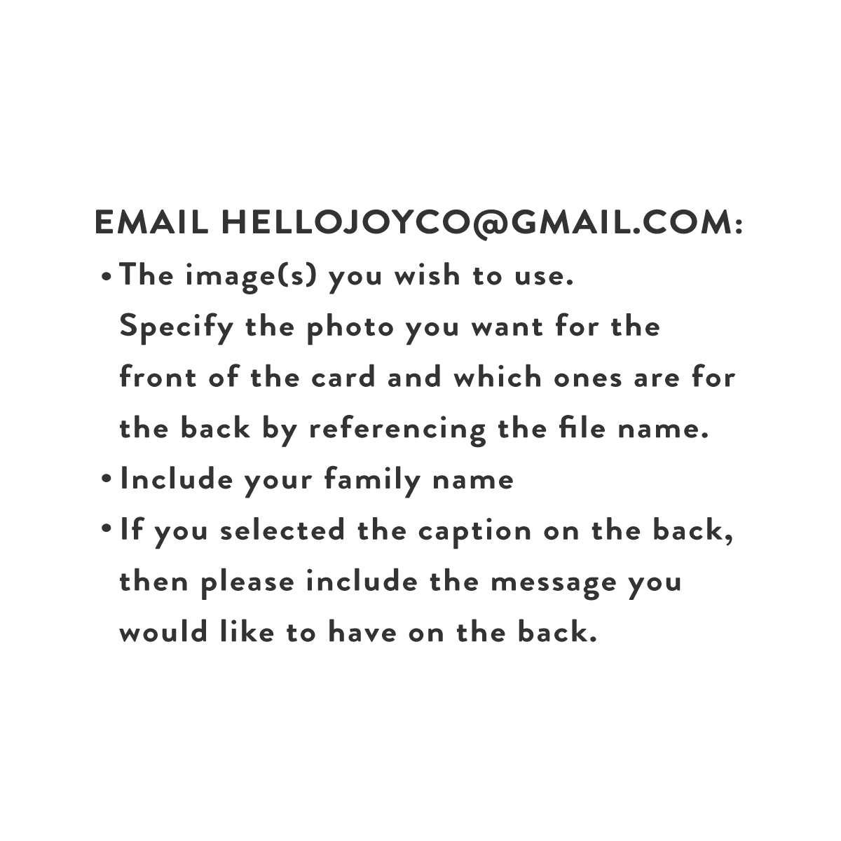 • The image(s) you wish to use. Specify the photo you want for the front of the card and which ones are for the back by referencing the file name. (Example: Front - DSC_7333.jpg)